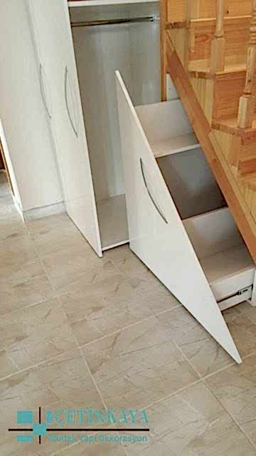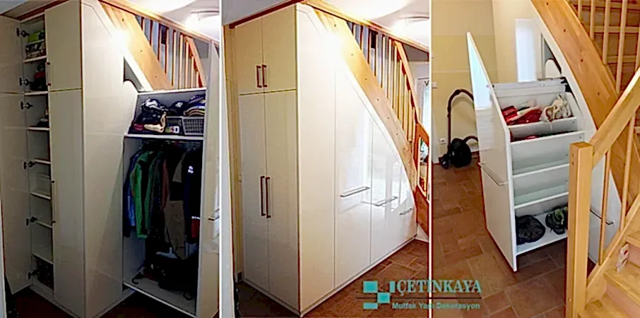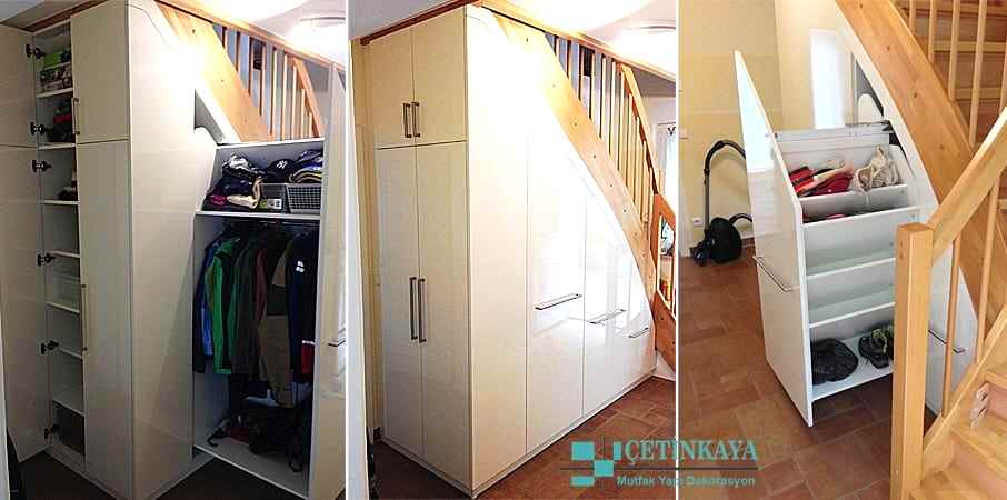 Akla gelmeyen yerlere örnek olarak merdiven altını tercih edebilir. Merdiven altı öyle şahane bir şekilde döşenir ki kullanışlı bir olabilir. Tripleks yada dubleks bir eviniz var ise en çok tercih bu yönde olur. Merdiven altına şık bir raf yada dolap düzenlenebilir, oda dışında kullanılabilir. Merdiven altına vestiyer şeklinde dolap yapılır ise ayakkabılarınızı muhafaza edilebilecek bir yer kazanılır. Merdiven altı dışında basamakları da kullanılabilir alternatif seçeneklerdendir. Basamaklar açılabilir vaziyette olur ise kışlık giyeceklerimizi muhafaza edebilir çocuklarımızın oyuncaklarını dahi saklayabilirsiniz.